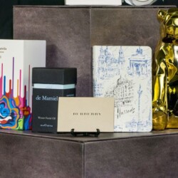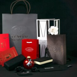 Les compositions ci-dessous comprennent également un sac Clarins fait main, une invitation pop-up Louboutin, un jeu d’enveloppes Longchamp, un coffret à vin Harvey Nichols, et bien d’autres articles. Cet ensemble montre notre savoir-faire non seulement en emballages de luxe, mais également en terme de gifts et prints.